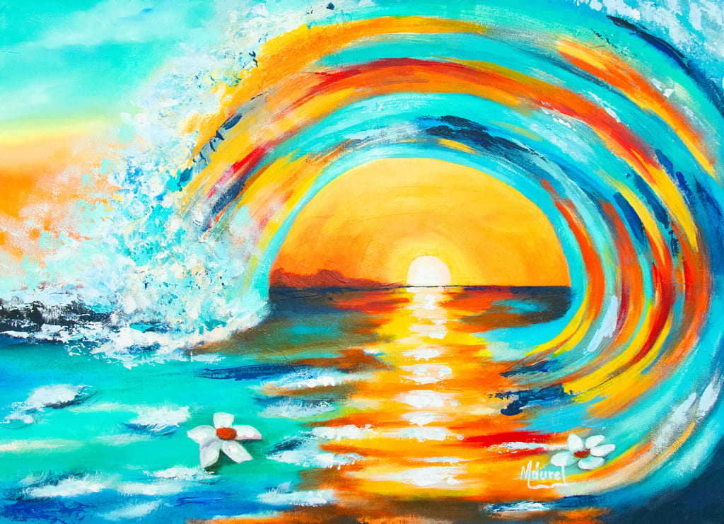 La ola, en su ascenso danzante, se convierte en arco iris líquido. Colores cálidos y fríos dialogan en armonía perfecta. Cada pincelada vibra como una melodía del mar. Las flores flotantes simbolizan la paz en medio del movimiento. Es un instante eterno donde la naturaleza celebra su esplendor.
